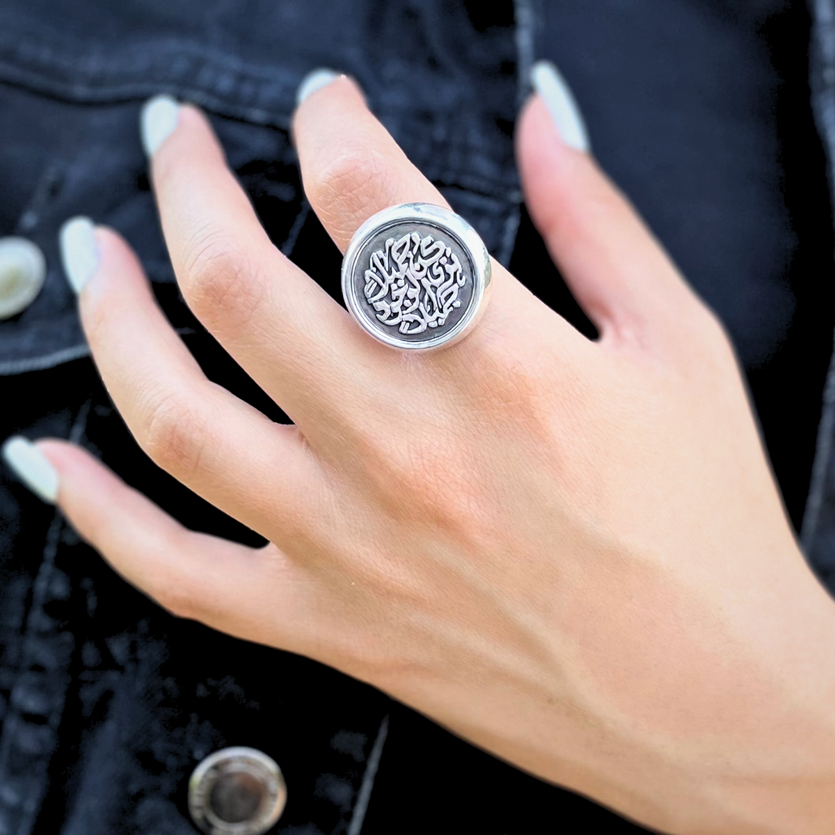 هذا الخاتم احتفاءٌ بالأناقة الخالدة والتراث الثقافي. تصميمه الدائري الجريء مزينٌ بخطوطٍ بديعة، ترمز إلى جمال التعبير الهادف. صُمم هذا الخاتم تكريمًا للتقاليد مع احتضان الحداثة، وهو مثاليٌّ لمن يُقدّرون عمق الفن ويسعون إلى إضفاء لمسةٍ تاريخيةٍ أينما ذهبوا.