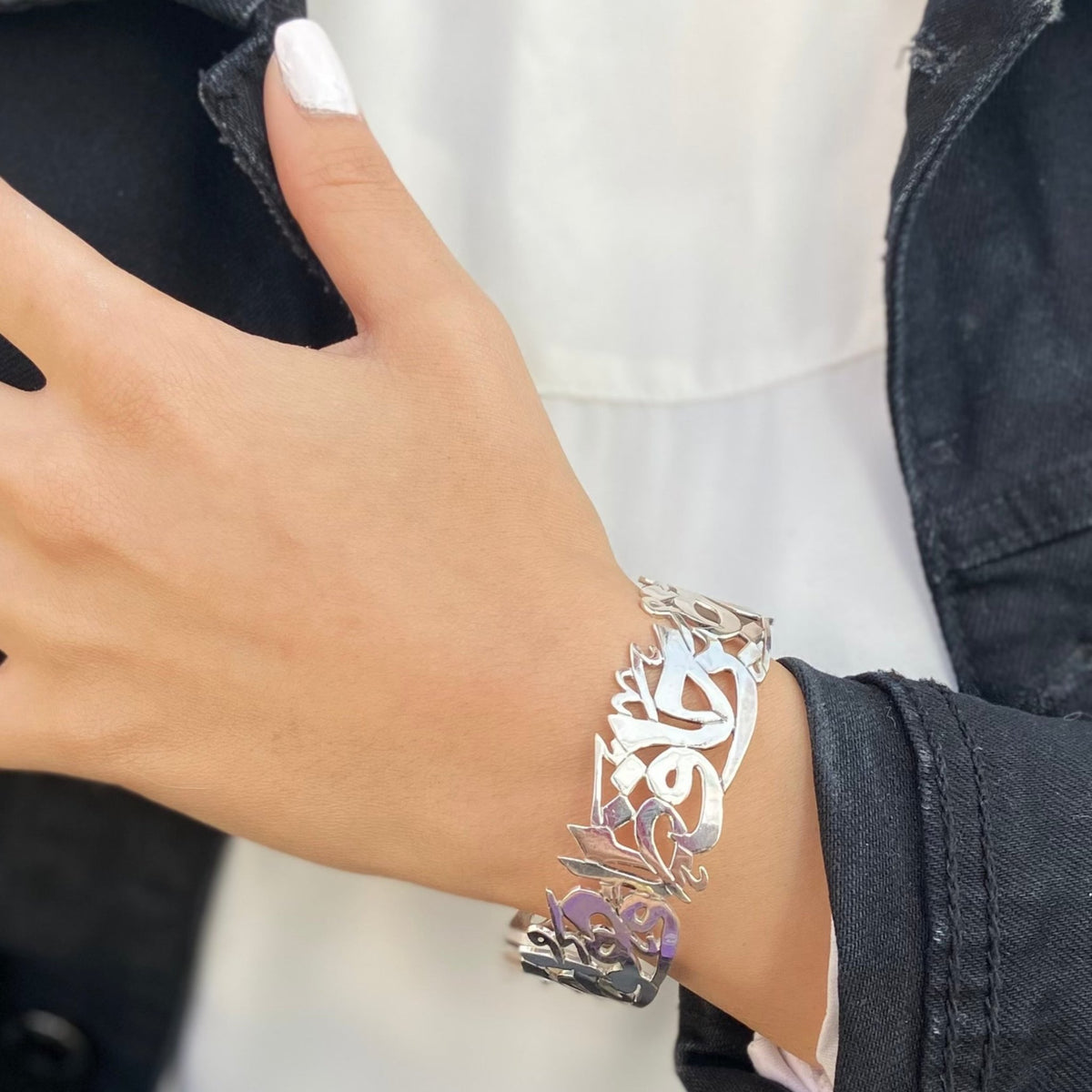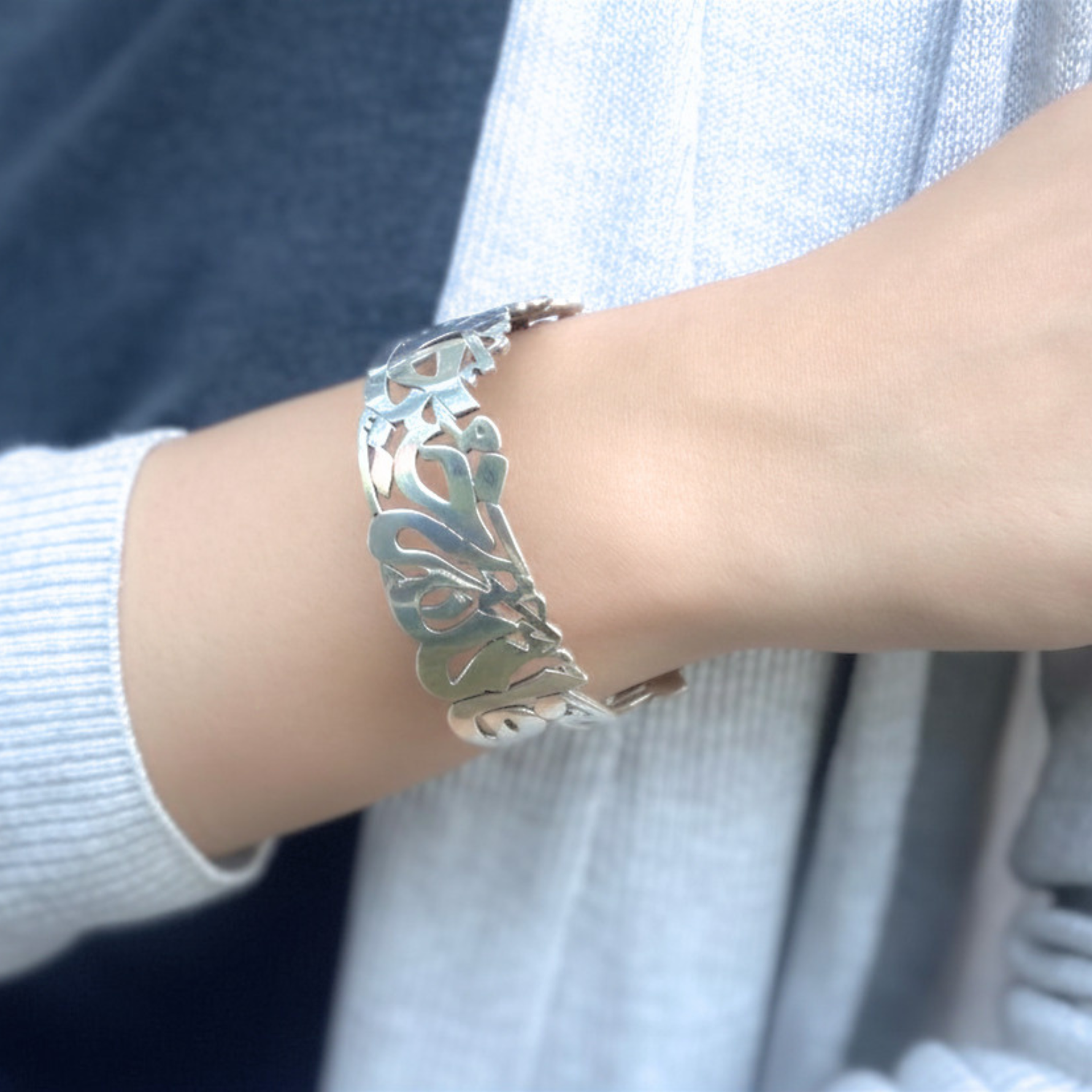 هذا السوار الزهري، احتفاءً حقيقياً بجمال الطبيعة، تحفة فنية تلتف حول معصمك برشاقة. تصميمه المعقد من الأوراق والبتلات المحفورة على الفضة يضفي عليه لمسةً من الانسيابية والأناقة. كل عنصر من عناصر هذا السوار يروي قصة نمو وتحول وسحر الطبيعة الخالد. مظهره الرقيق والجريء مثالي للارتداء في النهار والمساء، يضفي لمسةً من الأناقة على أي إطلالة. سواءً ارتديته مع ملابس كاجوال أو فساتين سهرة، سيضيف هذا السوار لمسةً فريدةً مستوحاةً من الطبيعة إلى مجموعة مجوهراتك.