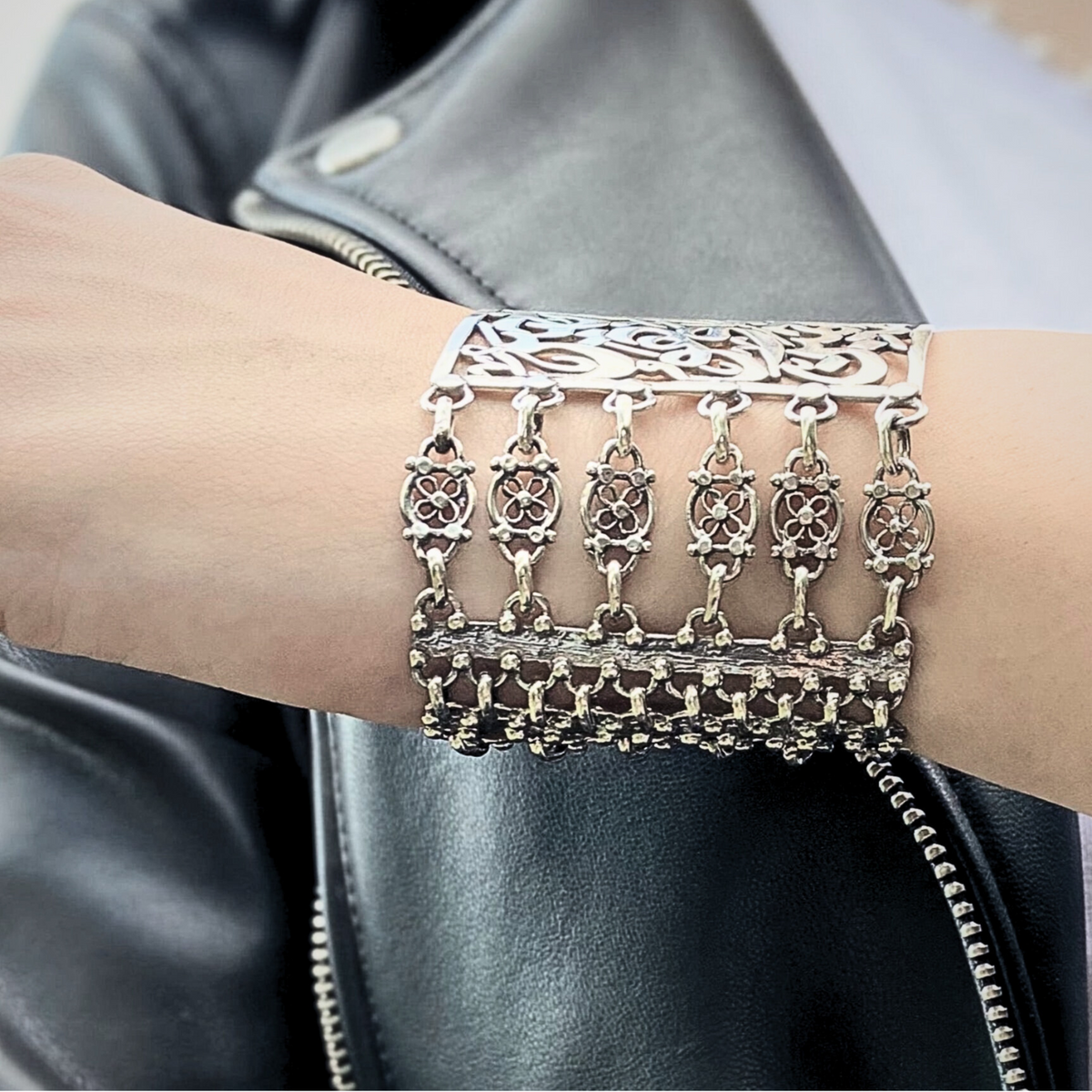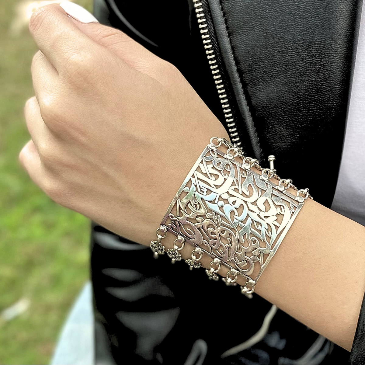 This elegant Arabic bracelet features beautifully crafted calligraphy intertwined with delicate silver chains, creating a unique blend of cultural artistry and modern design. Perfect for those who appreciate meaningful jewelry that celebrate heritage with style.