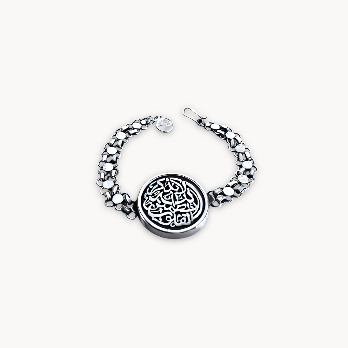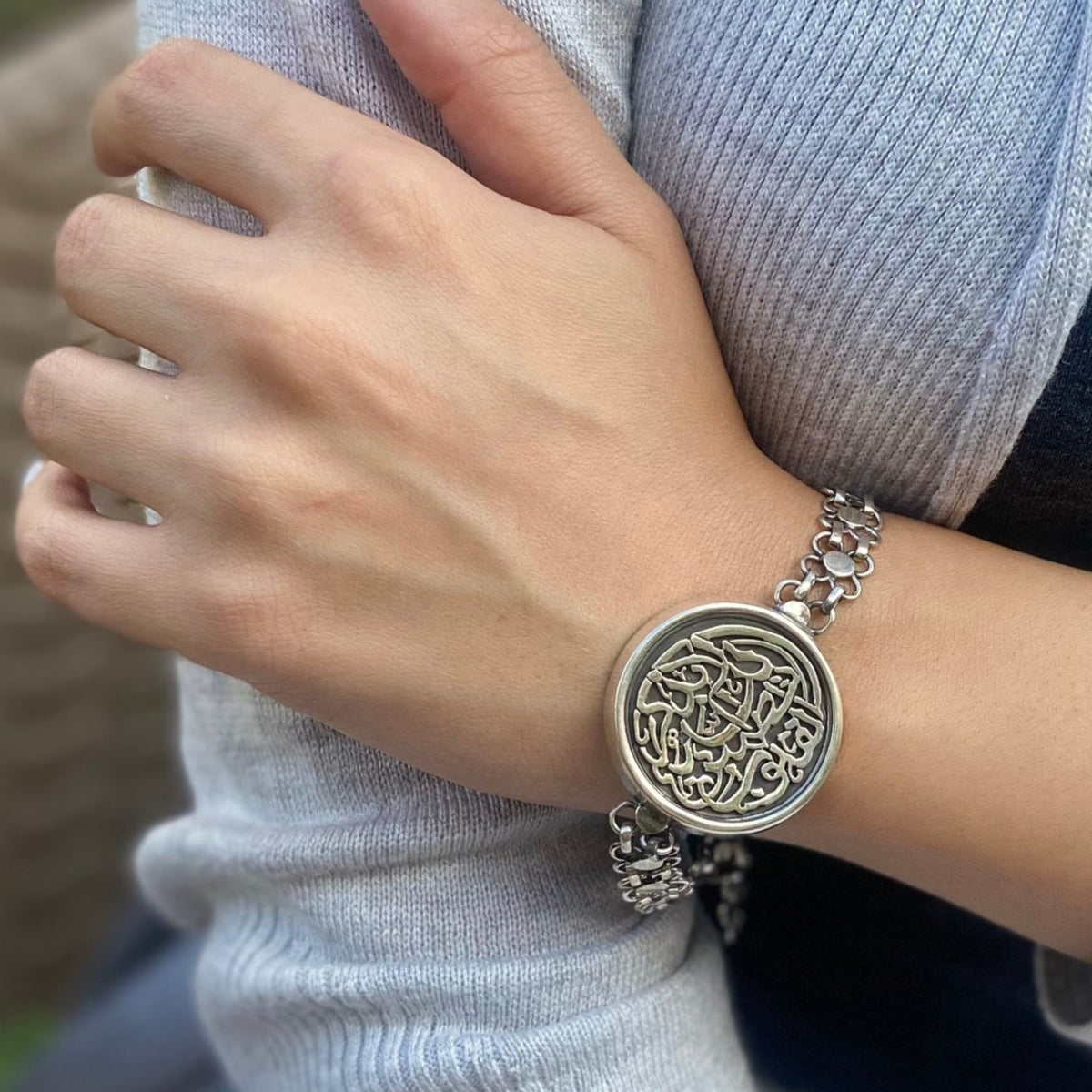 A graceful fusion of tradition and modern elegance, this Arabic bracelet features intricate calligraphy craftsmanship that tells a story of heritage and artistry. Handcrafted from premium sterling silver, its delicate design highlights refined details, making it a truly unique accessory. Perfect for adding a sophisticated touch to any outfit, this bracelet celebrates cultural beauty with timeless style.
