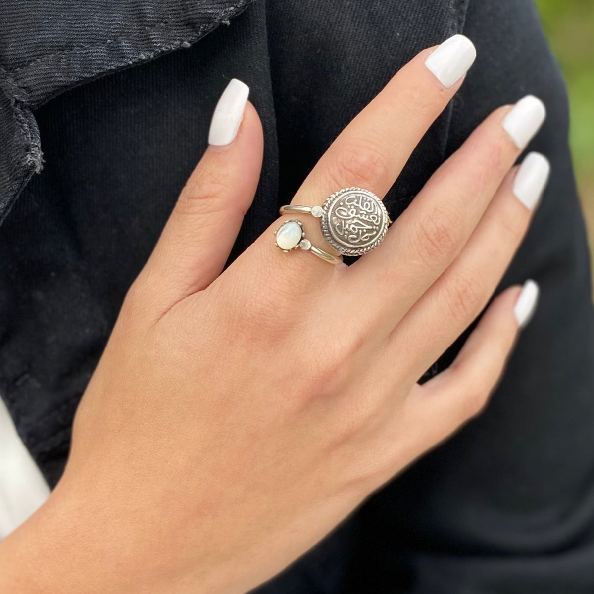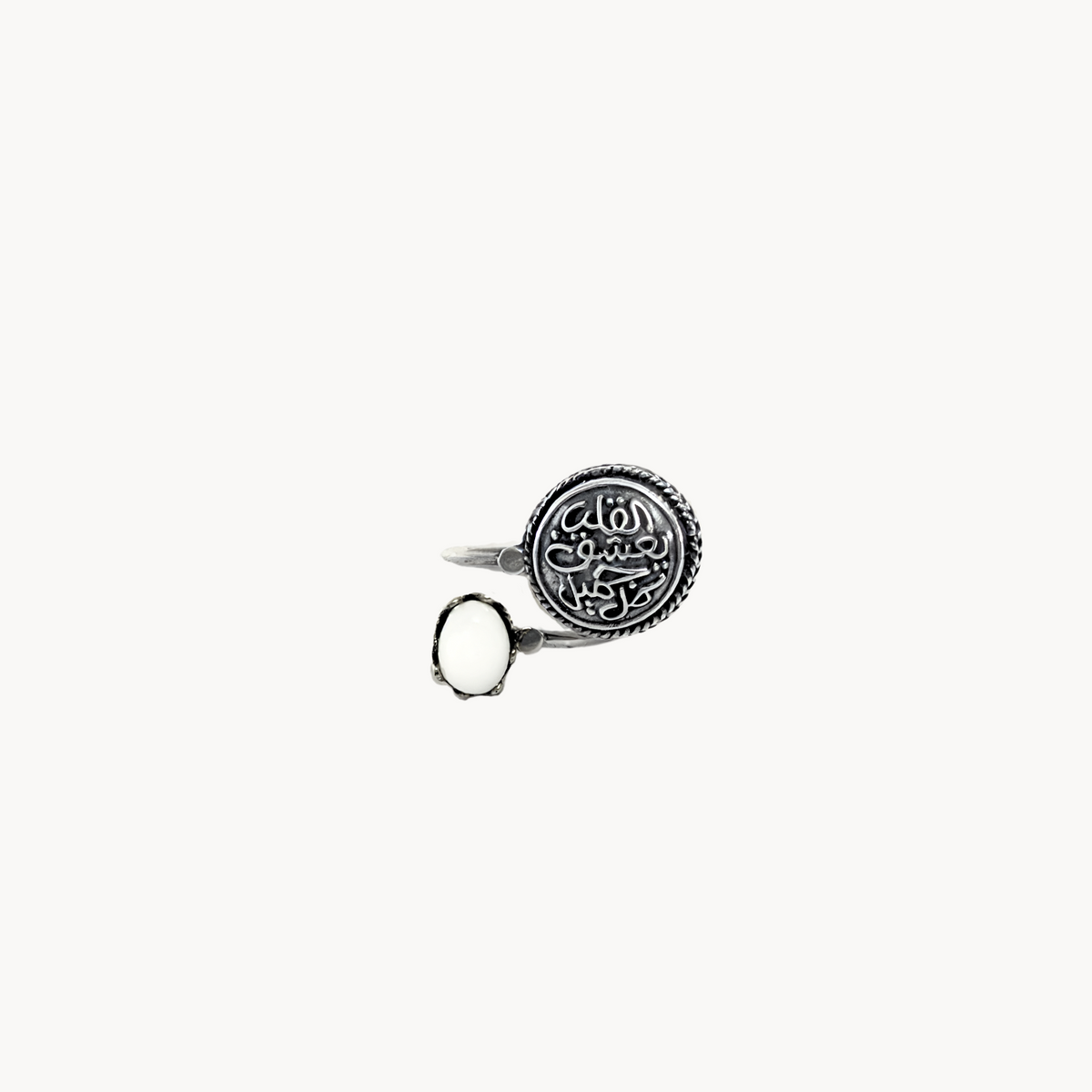Unit price perThis ring is a harmonious blend of celestial elegance and timeless artistry. Featuring an ethereal moonstone and intricately engraved Arabic calligraphy, it represents a union of spiritual reflection and cosmic beauty. Each detail tells a story of grace and enlightenment, making this piece a beacon of inspiration for those who wear it.