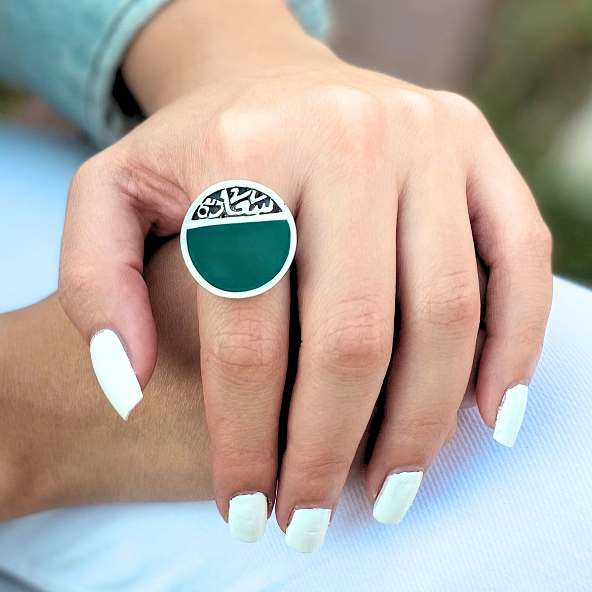 Unit price perMinimalist yet striking, this round ring merges modern design with traditional Arabic calligraphy, complemented by a rich green enamel accent. Perfect for adding a touch of sophistication to any look.