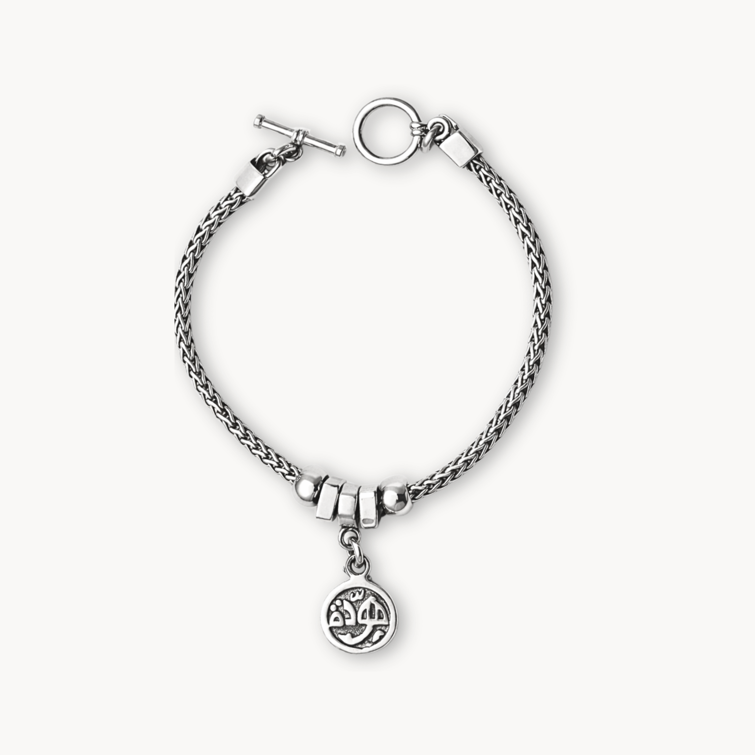 Unit price perA handcrafted sterling silver strand bracelet finished with an ornate engraved coin charm saying Mawada — affection and harmony. The woven chain design and secure toggle clasp offer timeless everyday comfort with premium elegance.