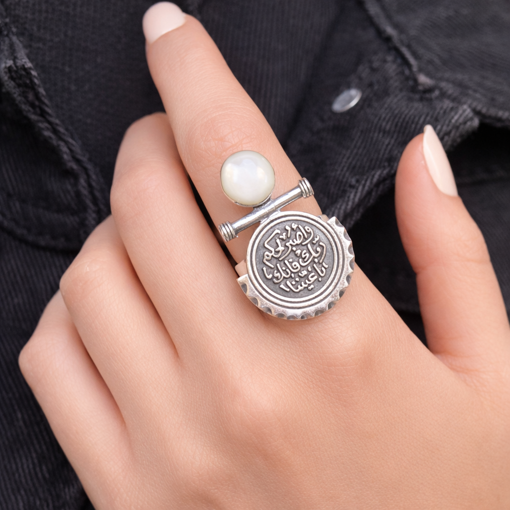 Unit price perMake a bold statement with the Eternal Charm Ring, crafted from high-quality sterling silver. This unique design combines intricate calligraphy with a striking black stone, creating a perfect blend of tradition and modern elegance.