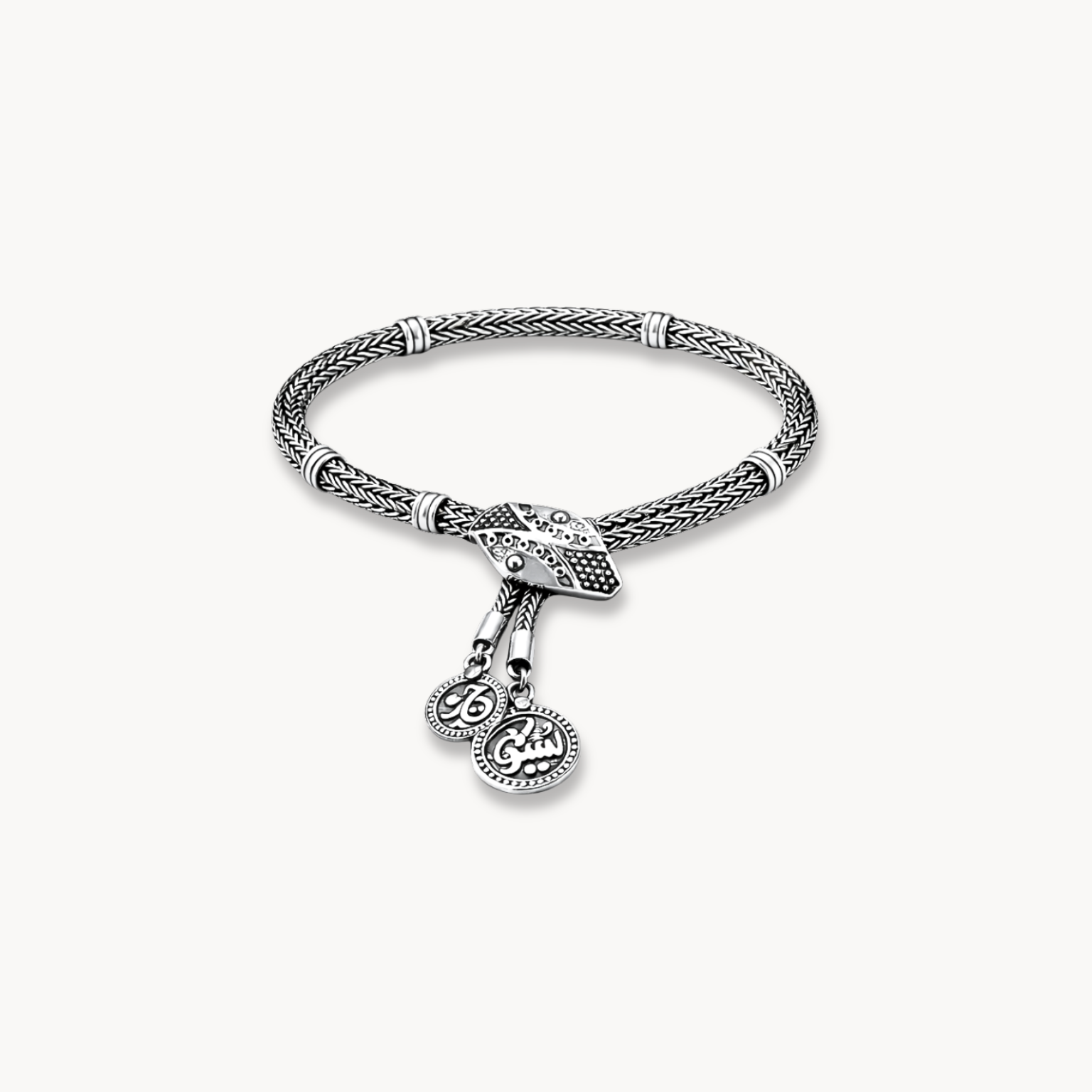Unit price perA handcrafted sterling silver strand bracelet featuring a sculptural cobra clasp that gently embraces the wrist, finished with an intricately engraved coin charm. Designed for comfortable everyday wear with timeless boho elegance and a secure refined fit.
