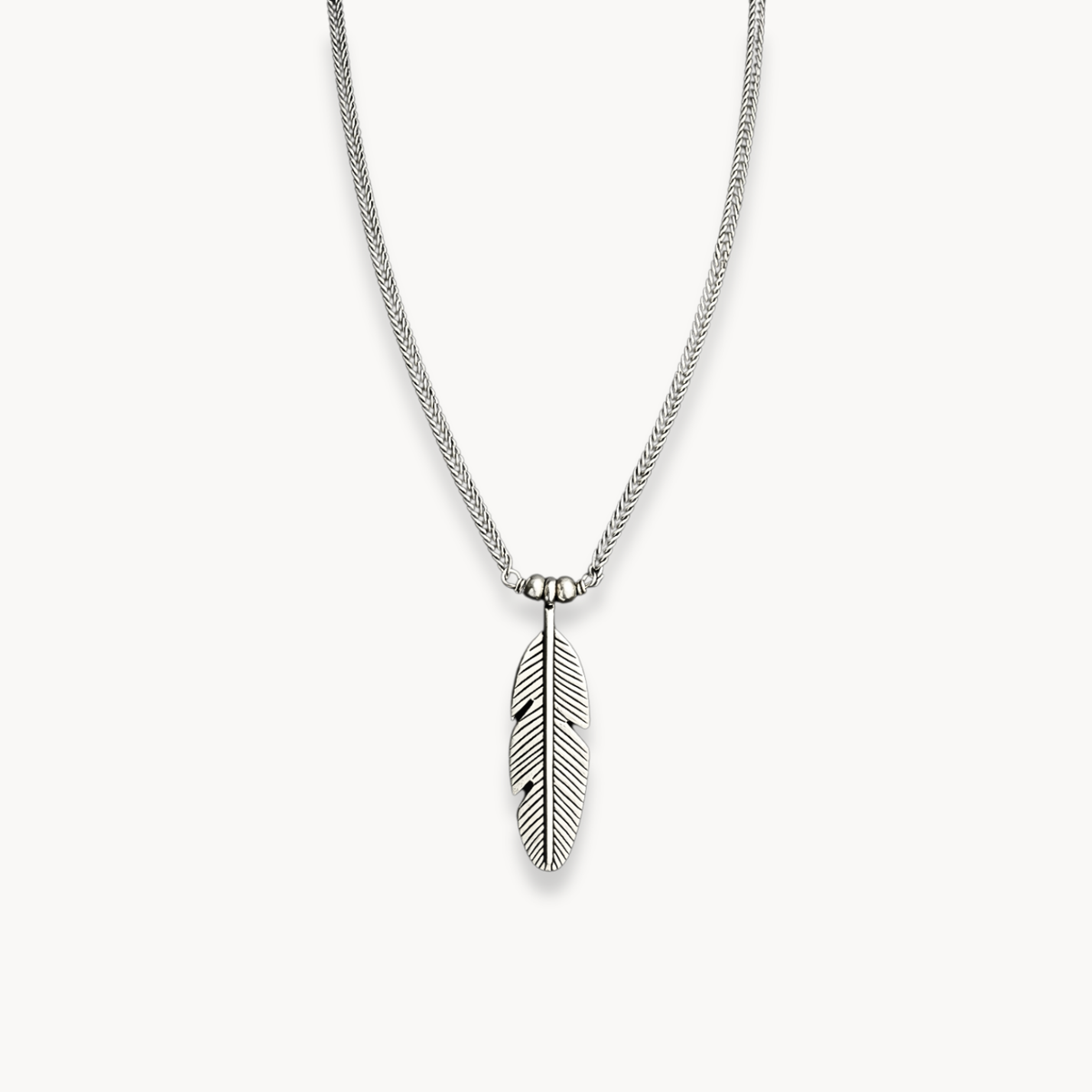 A handcrafted sterling silver necklace featuring a finely engraved feather pendant symbolizing the lightness and devotion of the soul. The minimalist form offers timeless reflections on a classic comfortable chain.