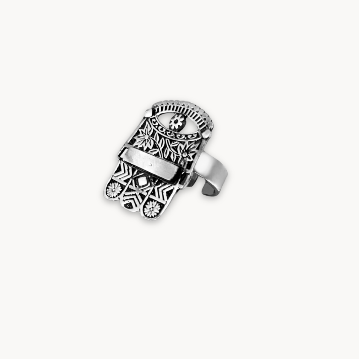Unit price perA bold handcrafted sterling silver ring inspired by ancient Egyptian talismans, shaped as a protective shield and finished with intricate oxidized engraving. The sculptural design reflects heritage power with a comfortable adjustable band for everyday confidence.