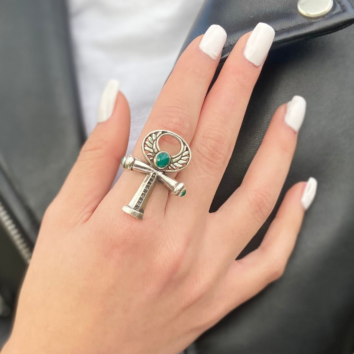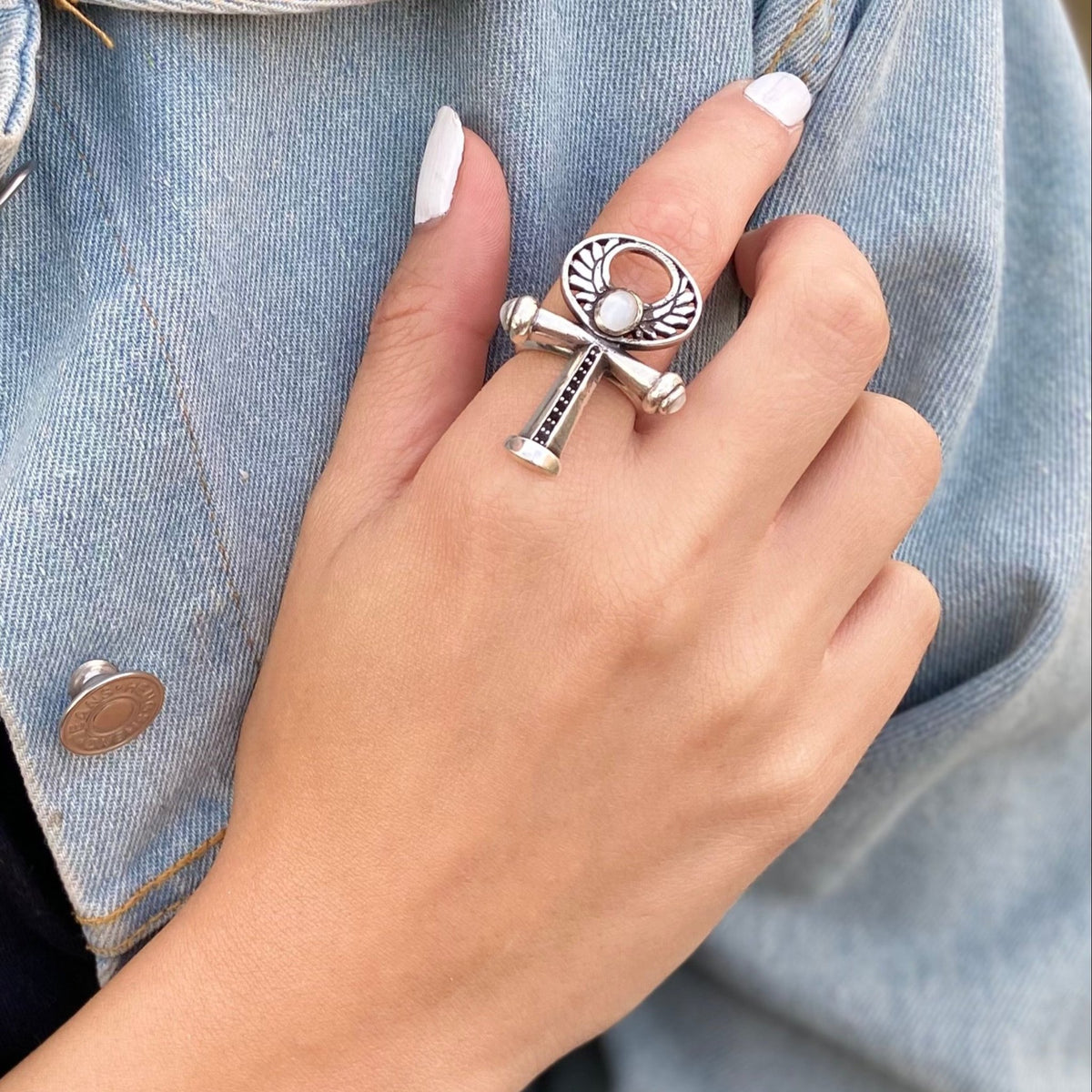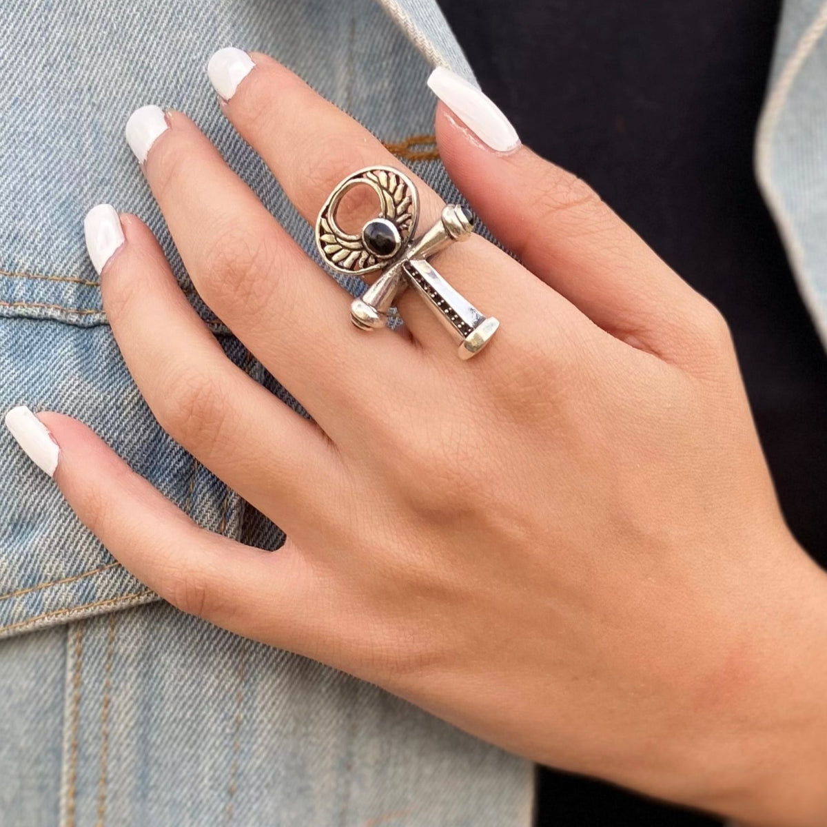 Unit price perCelebrate history and elegance with the Ankh Symbol Statement Ring, a bold tribute to ancient Egyptian heritage. Handcrafted from premium sterling silver, this ring features the iconic Ankh symbol, representing life and eternity, adorned with an intricate circular motif and a striking black gemstone accent for added depth and charm. Its bold design makes it a standout accessory.