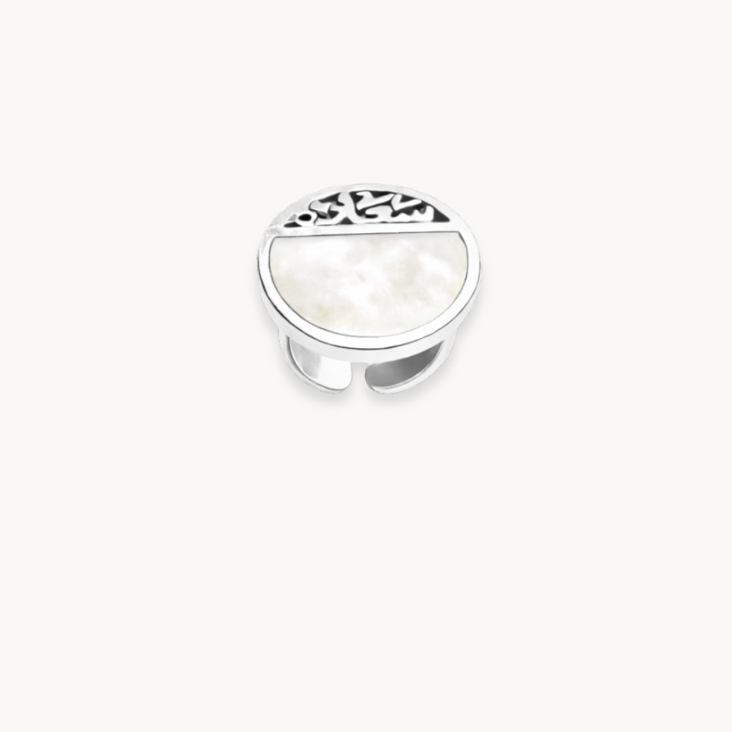 Unit price perModern sterling silver ring featuring Arabic calligraphy and a bold green enamel horizon, designed for refined everyday elegance.