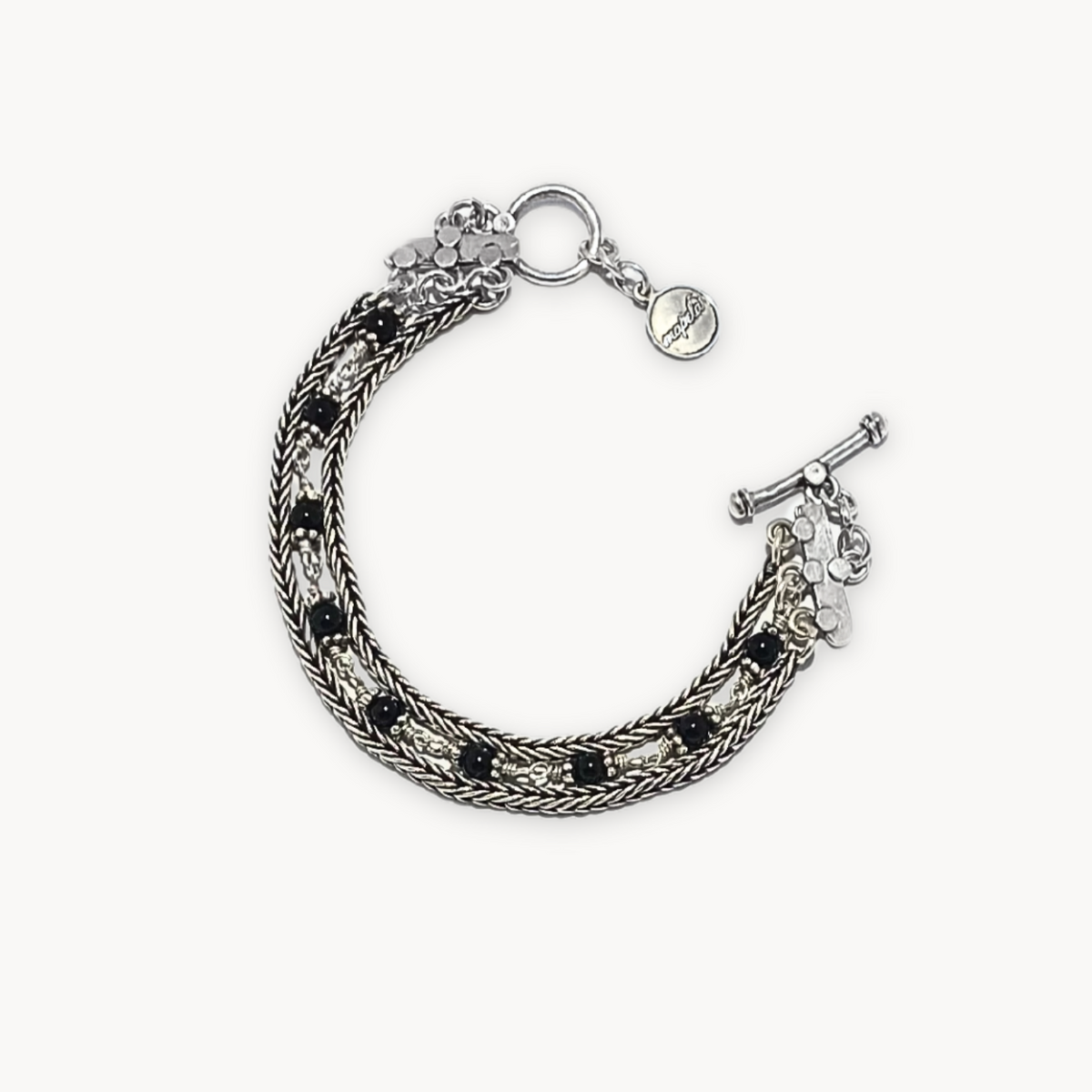 This bracelet features an intricate braided silver design, paired with striking black onyx beads that add depth and contrast to the piece. The herringbone pattern in the silver chain brings texture and movement, creating a sophisticated and modern look. The black onyx beads introduce a touch of mystery and elegance, making this bracelet perfect for both casual and formal occasions. The combination of the braided texture with the dark beads creates a beautiful balance, making it an ideal accessory for anyone looking to elevate their everyday style.
