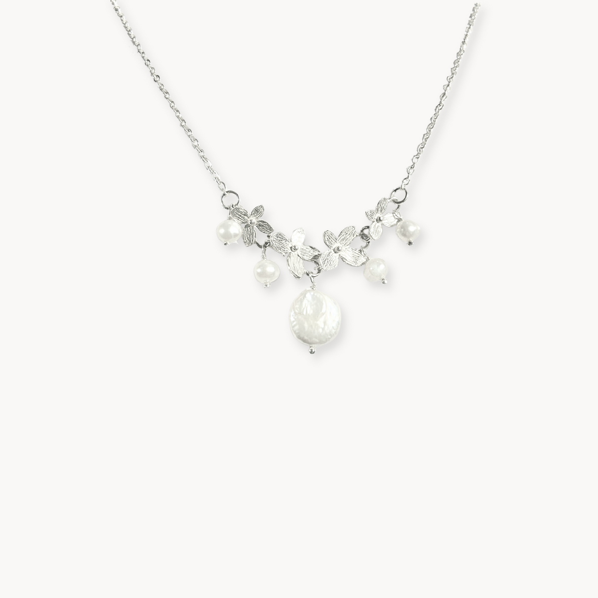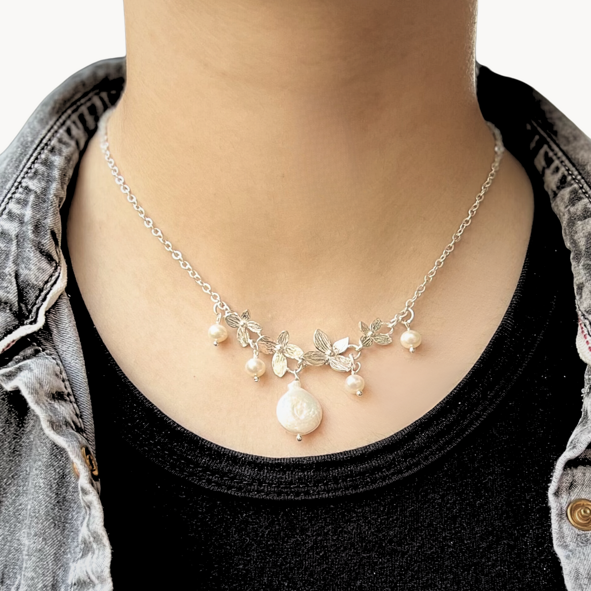 - Design: Delicate silver floral accents paired with dangling pearl charms