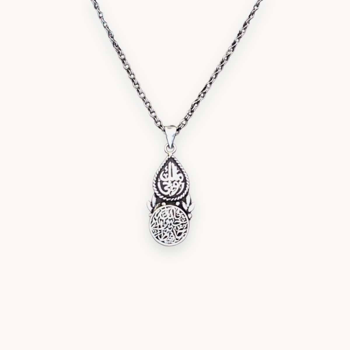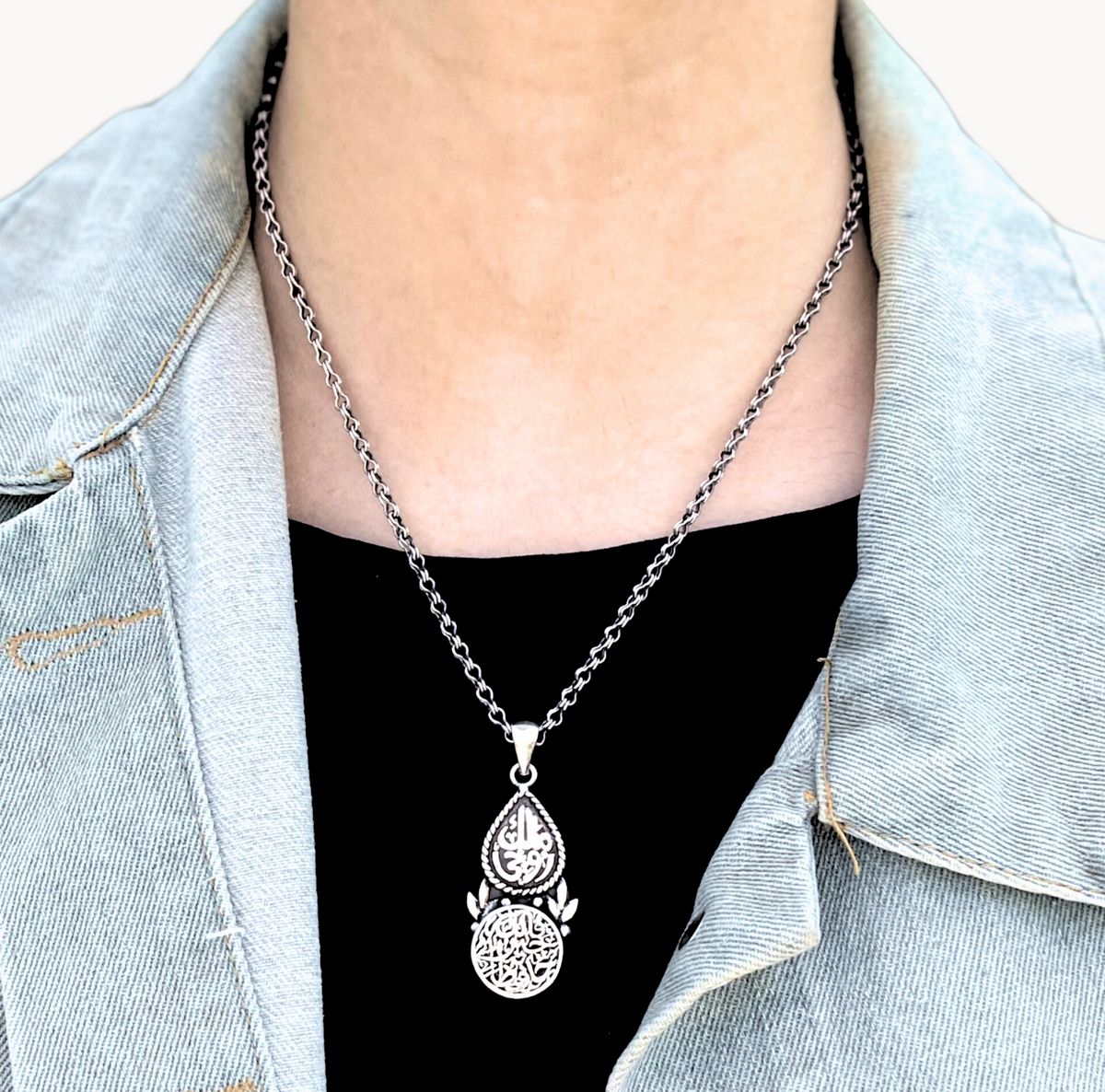 Unit price perElegance meets heritage in the Dual Calligraphy Pendant Necklace. This handcrafted sterling silver piece features two intricately engraved pendants, beautifully stacked to create a balanced, timeless design. Each pendant showcases delicate Arabic calligraphy, celebrating artistry and culture.